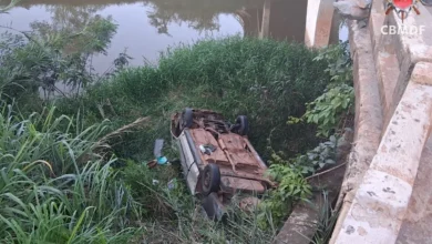 Carro com crianças despenca de ponte na BR-060 após acidente e vítimas são resgatadas